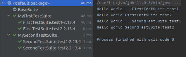 Si necesitamos definir clases de test con componentes comunes, se define una herencia de clases cuya clase base defina todo aquello que sea común. Si necesitamos modificar el nombre de los test de dos clases diferentes, definimos una clase base con el transformador del nombre de test y, sus clases hijas, heredan de dicha clase base. Un código ejemplo es el siguiente: