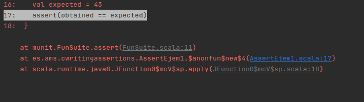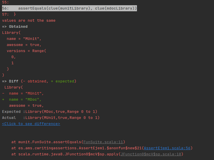 Como se observa en la imagen anterior, MUnit muestra la diferencia en los valores de los objetos que se utilizan en la aserción.