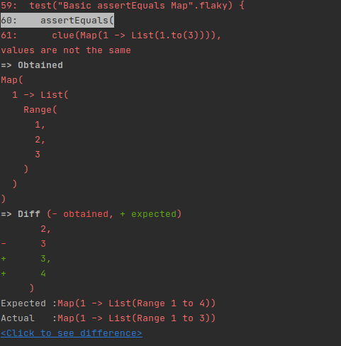 Supongamos que definimos un test que realiza la comparación entre dos objetos definidos en una case class, el test sería el siguiente: