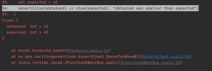 MUnit ofrece la posibilidad de mostrar información sobre aquellos test cuyo resultado no es válido. Para mostrar información adicional, es necesario utilizar la función clue; para su mayor comprehensión, mostramos los siguientes ejemplos de test con sus respectivas salidas por consola: