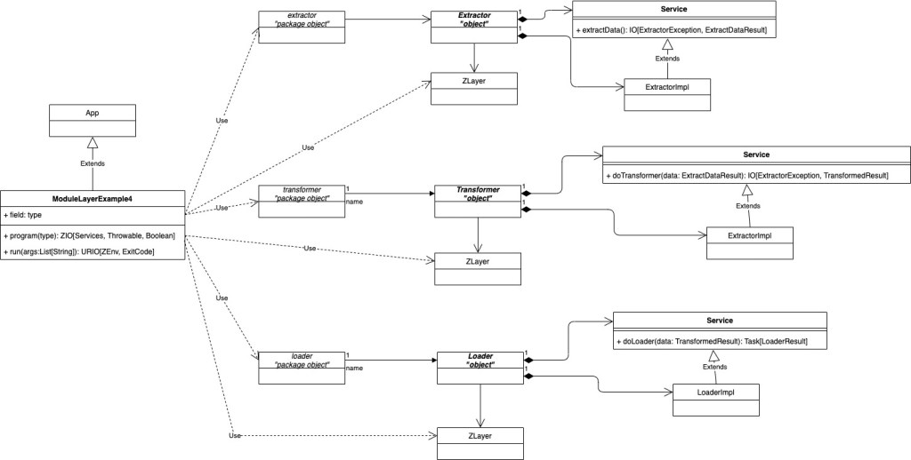 En la parte inferior del diagrama tenemos los elementos que definen el cargador Loader. Se define un objeto con nombre Loader el cual tiene una relación de composición por valor con un trait llamado Service el cual define la operación de carga con la función doLoader; esta función, retorna un elemento de la librería ZIO de tipo Task con un ADT de tipo LoaderResult. El tipo Task de ZIO es aquel tipo definido para tareas asíncronas. El objeto Loader tiene un atributo con nombre live el cual define el módulo de ZIO ZLayer asocoado a la clase que implementa el servicio LoaderImpl. Para finalizar, se define un objeto de paquete para enlazar las funciones del objeto Transformer. El snippet del código es el siguiente: