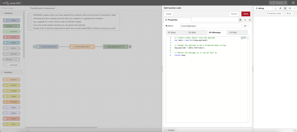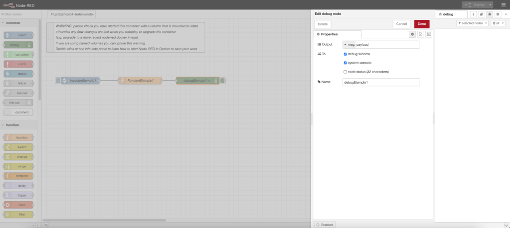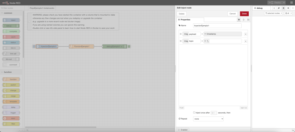 El flujo se compondrá por los siguiente nodos: el primero, un nodo de tipo common de tipo inject el cual inyecta un valor; el segundo, un nodo tipo función el cual, el valor que recibe como parámetro de entrada, lo procesará y retornará para el siguiente nodo; y, por último, un nodo de tipo debug el cual realiza la escritura del valor inyectado.