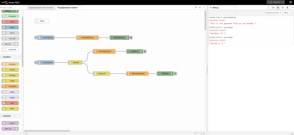 Para finalizar, definimos un flujo de trabajo compuesto de dos flujos. El primer flujo es aquel que trabaja con el nodo función plantilla el cual aplica una plantilla de texto al valor inicial insertado; dicha plantilla con el parseo del valor de entrada, se escribe en la consola de debug. El segundo flujo, define un flujo de trabajo con una bifurcación.