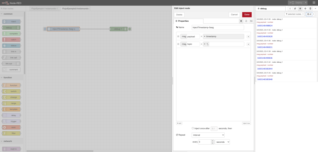 Para la realización de una inyección de datos, se emplea el nodo de inyección en el cual se define en el objeto msg el valor que se quiere inyectar al flujo; y, para definir el intervalo de repetición, en el campo «Repeat» ubicado en la parte inferior del cuadro, definimos la frecuencia de repetición. En el ejemplo, hemos definido un intervalo de 3 segundos en el cual se inyecta el valor timestamp. El nodo siguiente es un nodo de tipo debug el el cual escribirá en consola en valor timestamp. Desde un punto de vista gráfico, la definición del flujo de trabajo queda representado en la siguiente imagen con la captura de pantalla de NodeRED: