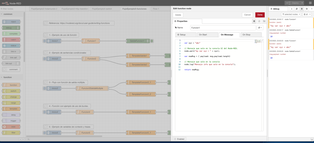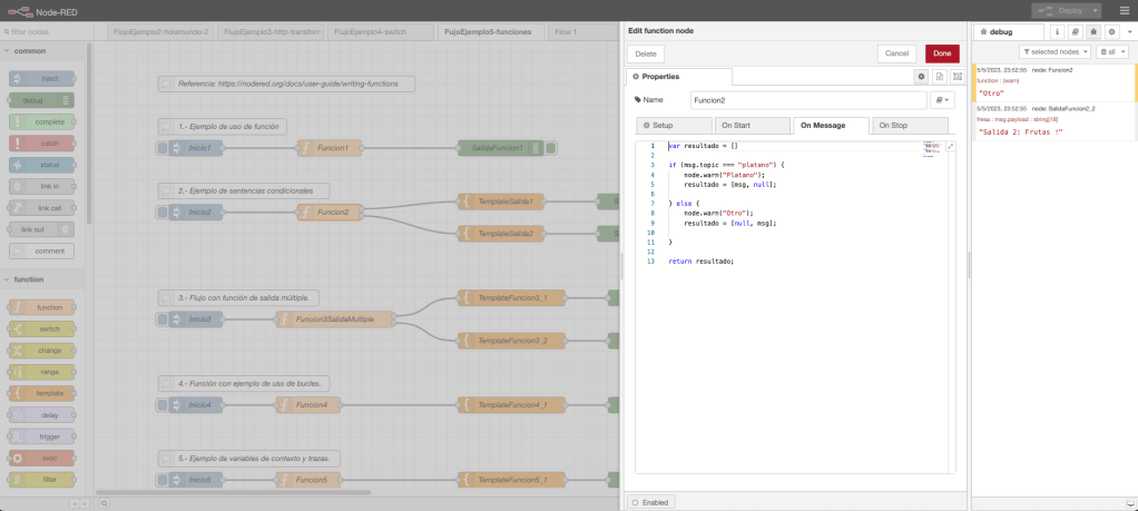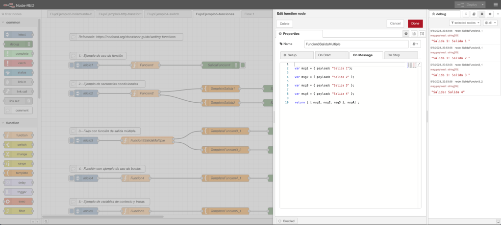 Los ejemplos mostrados en la entrada permiten mostrar cómo usar nodos función, algunas características básicas del lenguaje Java Script para la definición de funcionalidad en los nodos función y, además, cómo trabajar con diferentes tipos de entrada y salida con nodos tipo función.