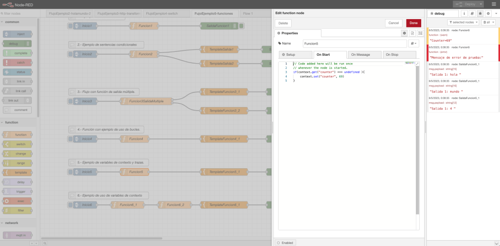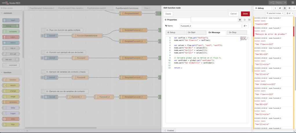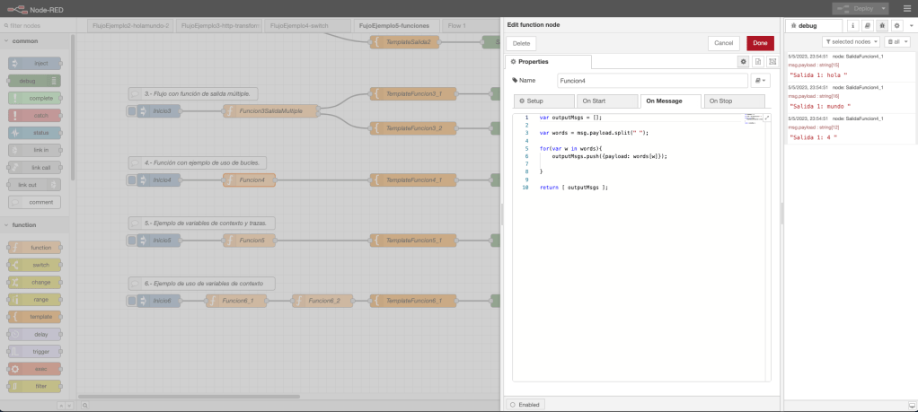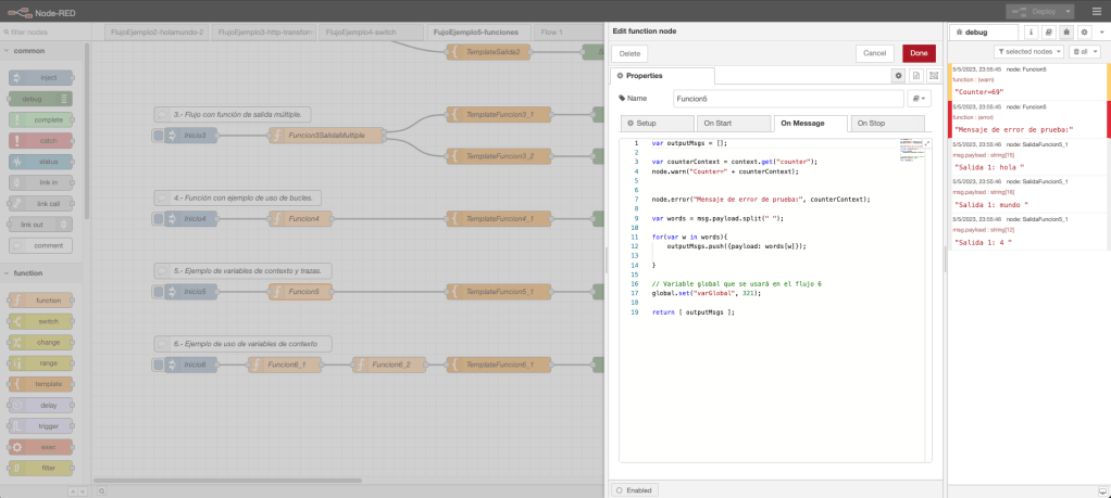 La funcionalidad del nodo función define una funcionalidad en el evento «On Message», la funcionalidad definida en este evento es la siguiente: definición de un variable de tipo lista, definición de una variable lista con el contenido del string pasado por parámetro, un bucle que recorre las palabras string y, como salida, retorna la estructura con las palabras. Además, se muestra por consola el valor de la variable de contexto «counter» y se crea una variable global con nombre «varGlobal» la cual se emplea en el flujo del ejemplo 6. En el evento «On Start», se define la variable de contexto «counter» utilizada en la funcionalidad «On Message».