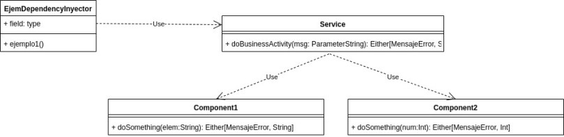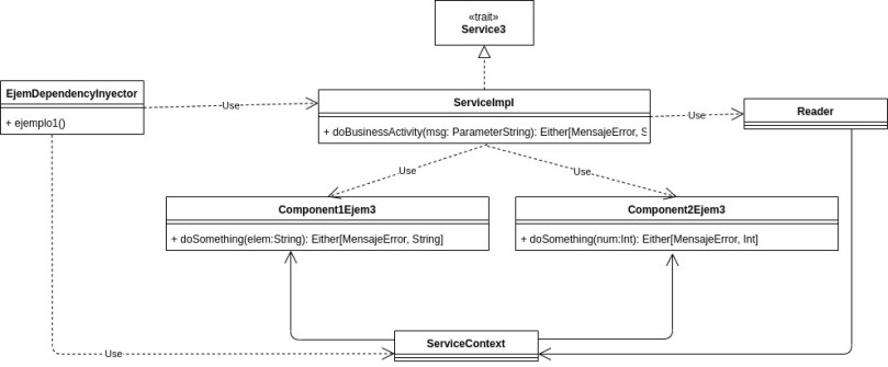 Para realizar el test del ejemplo anterior, usaremos el framework MUnit. La definición del test consiste en la declaración de una clase que herede de munit.FunSuite, en nuestro caso, la clase ServiceEjem1Test; ésta, define los test de prueba con la función test y, la verificación de resultado, se realiza con las funciones assert.